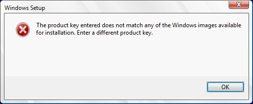 "The product key entered does not match any of the Windows images available for installation. Enter a different product key