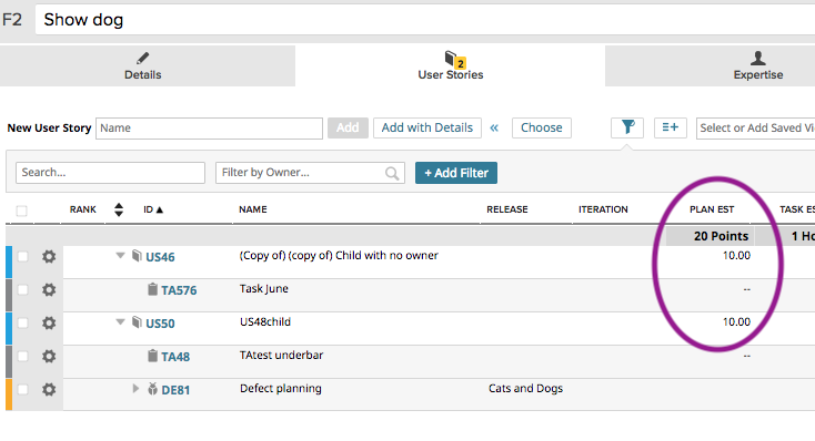 The Milestone scheduled item view total for plan estimate in the first screen is calculated based on the feature as well as user story relationships to that milestone. In this example F2 is associated to milestone M19 and therefore F2 is shown in this view, but by definition a feature does not itself have a plan estimate so no value shown or attributed to F2 for plan estimate. It is the artifacts themselves that are contributing to the total here. Note that US46 shows up twice, this is because it is part of F2 (which is associated to milestone M19) AND US46 is also associated to M19. US46 shows up as a child of F2 and as a separate line item as well. However, by design US46 (10 points) is only counted once in the total for the milestone. US50 is shown here because it is a child of F2 but US50 is NOT explicitly associated to milestone M19 so it's 10 points are not part of the M19 (milestone scheduled item) total. The 13 points total plan estimate for M19 are coming from DE16 (3 points) and US46 (10 points) as both of these artifacts are explicitly associated to milestone MS19.