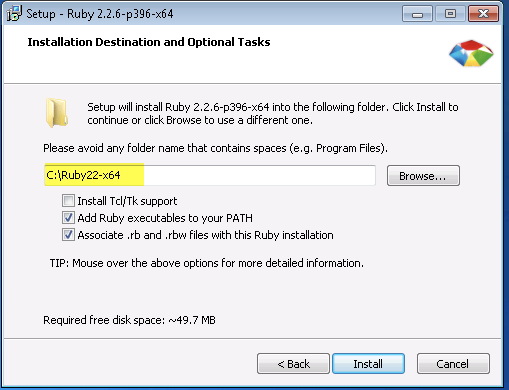 If Ruby is installed under a folder that contains a space, such as the Program Files folder, it can cause issues when our scripts attempt to reference gem in that location.