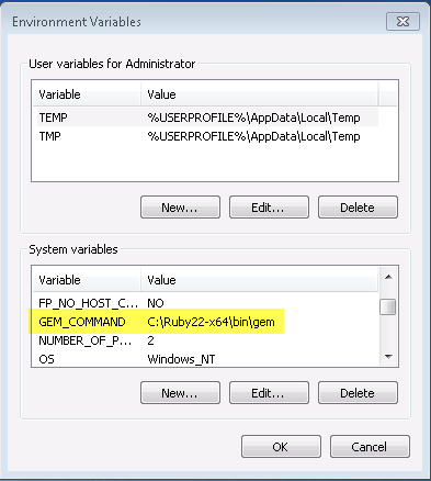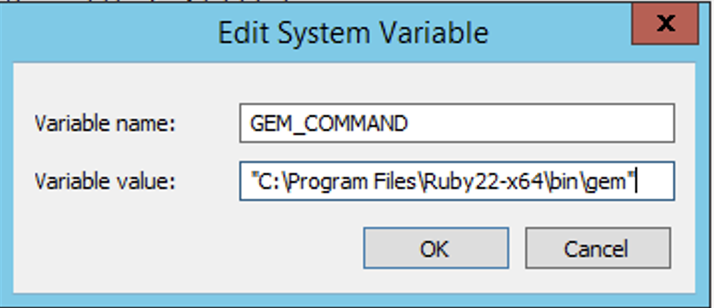 In the error message above, Ruby is installed in C:\Ruby22-x64 so GEM_COMMAND should be set to C:\Ruby22-x64\bin\gem as shown in the image below: