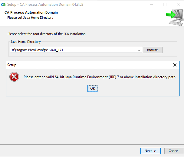 Error presented is: Please enter a valid 64-bit Java Runtime Environment (JRE) 7 or above installation directory path.