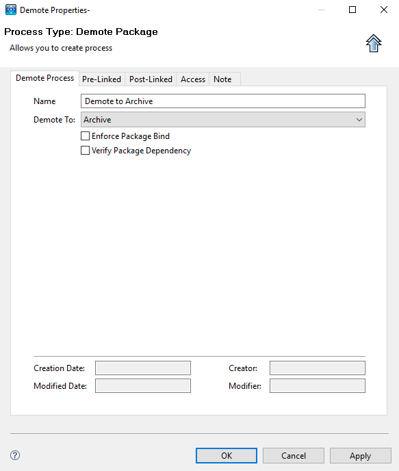 Next, make sure that all your states have a "Demote" process that demotes back to the previous state. In your initial state, create a "Demote" process to demote to the "Archive" state. For all your demote processes make sure the "Enforce Package Bind" and "Verify Package Dependency" checkboxes are unchecked.