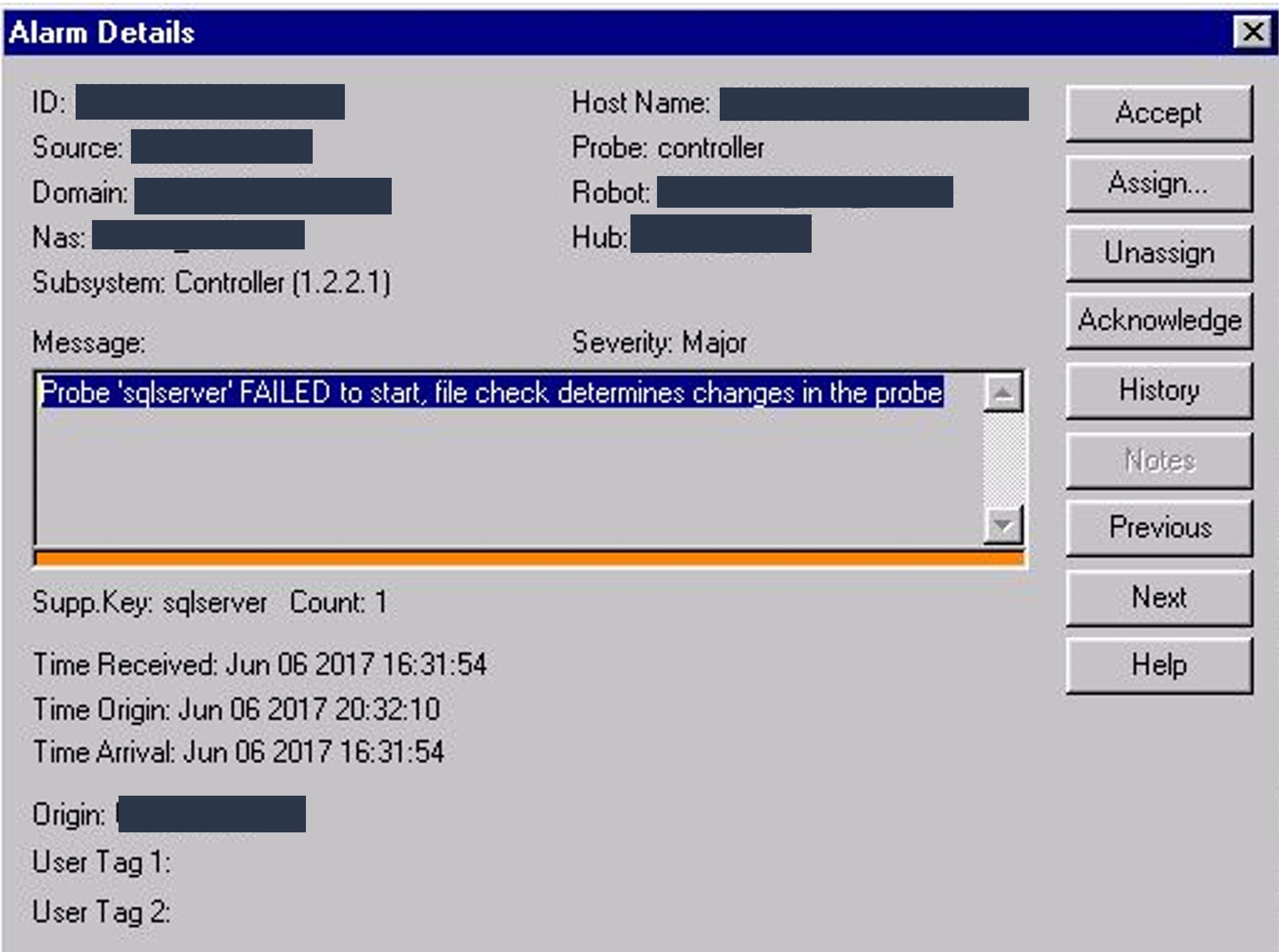 If probe machine name, IP Address or Mac Address changes, this could cause probes installed on a machine to fail and the system will generate an alarm with message: Probe '<PROBE_NAME>' FAILED to start, file check determines changes in the probe ", as an example:
