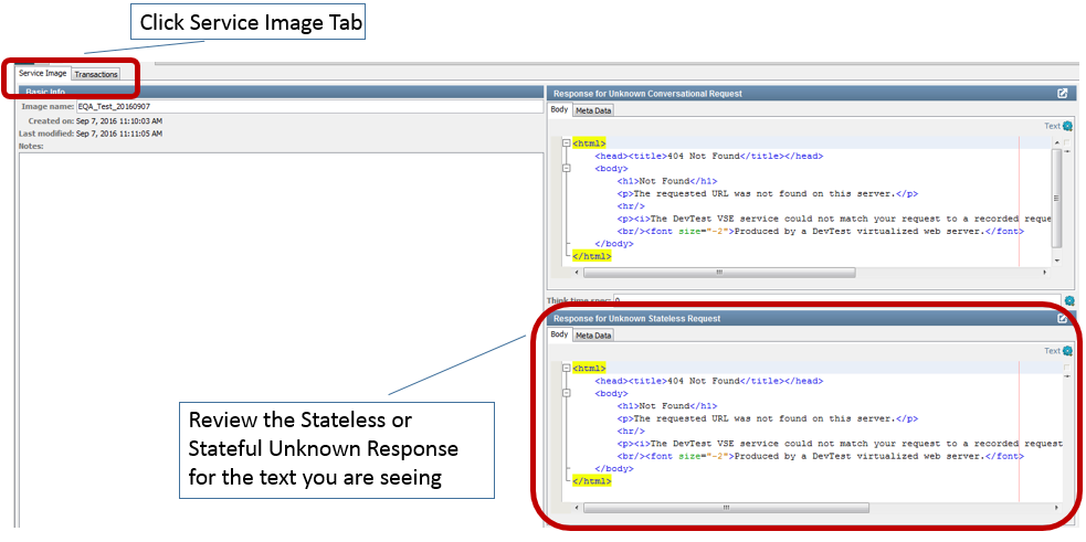 1. Service Image Tab: Open the VSI and CLICK on the Service Image tab in the upper left. Review the response in the Body tabs on the right (unknown conversational /Stateless response). The NO MATCH response is coming from here because the VSI could not match any transactions to an incoming request (located under the Transaction tab next to the Service Image tab). When there is no transaction match with the Request, DevTest sends the default no match Response "The LISA VSE service could not match your request to a recorded request".