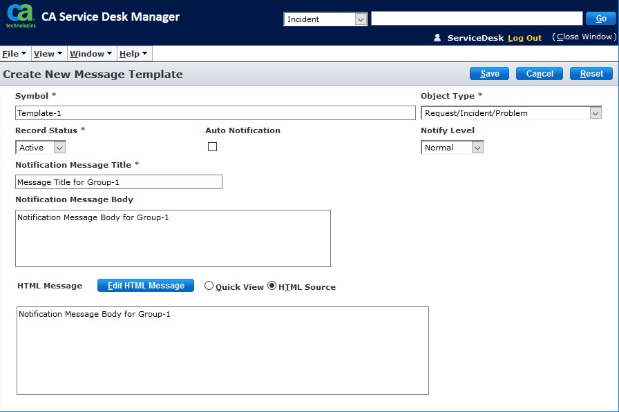 - Fill in the Message template content (See Figure 1 and Figure 2). This is where you may elect to write a custom message to be sent per Notification Rule (ie: you want to send one specific message to Group-1 and a completely different message to Group-2). Save with symbol "Template-1"