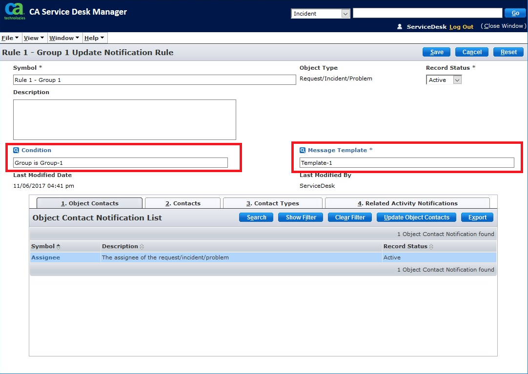 - Enter the “Condition” field as the Macro that was previously created, in this case "Group is Group-1". Enter the “Message Template” field, the template that was previously created, in this case "Template-1". Enter in the contacts who is meant to receive this notification, in this case, the Assignee (see Figure 11).