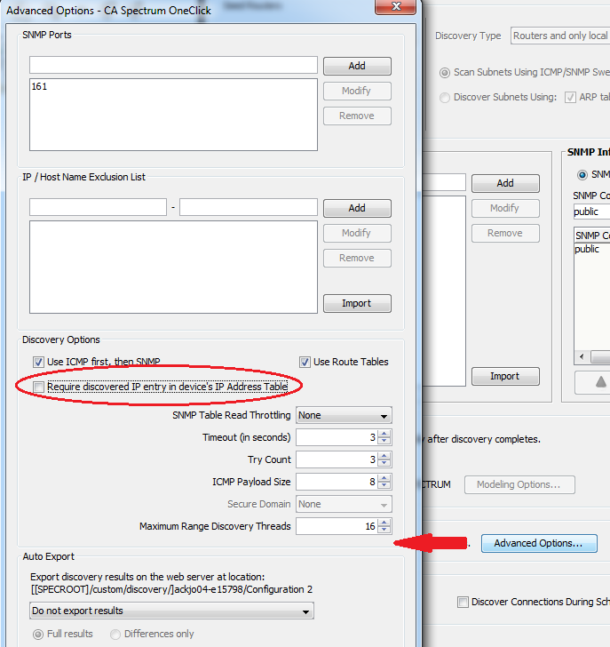 NOTE: You can tell the AutoDiscovery process to ignore this message by clicking on the "Advanced Options..." button in the Configuration tab and unchecking the "Required discovery IP Entry in the device;s IP Address Table" check box.