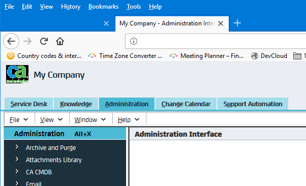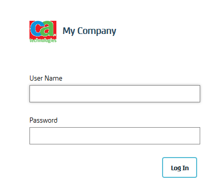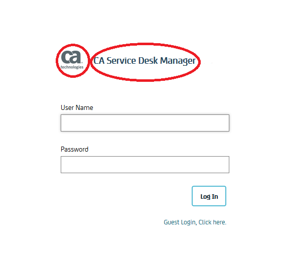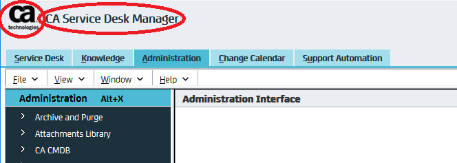 In the CA SDM install directory's NX_ROOT\site\mods\www\wwwroot\img directory, we add custom versions of the CAT_logo_53_trans.png and circleca.png files. In this example we modified the originals to have different colored backgrounds (CAT_logo_53_trans.png has a red background, circleca.png has a black background).