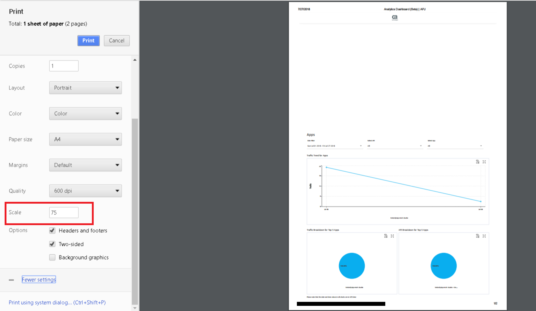 In the Portal UI, click on "Monitor", select Apps, and click "Print". The "Print" preview cannot show the complete traffic trend for app chart.