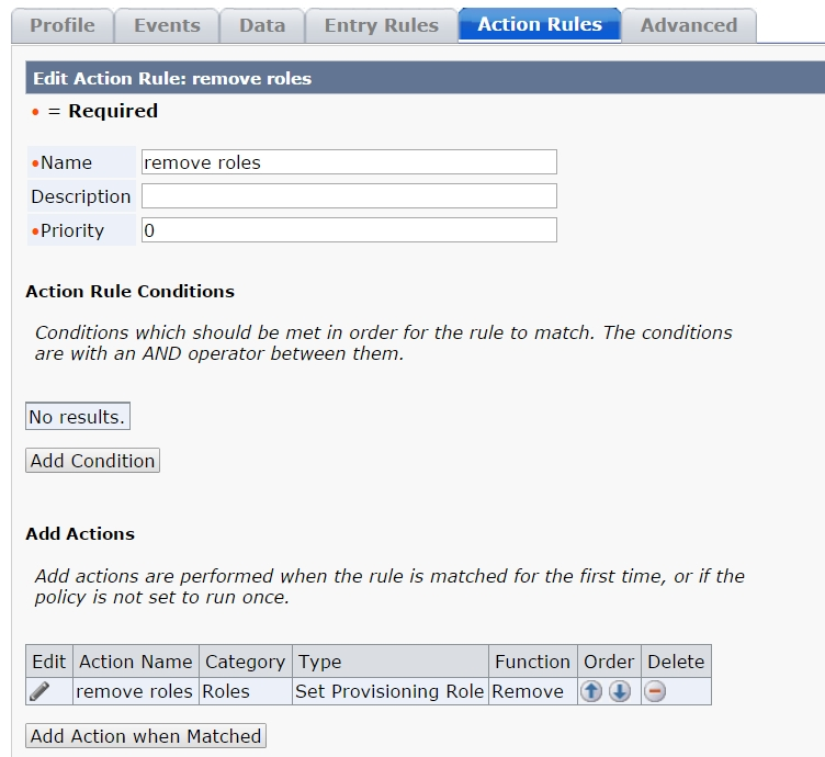 In a Production environment you will probably want to configure a custom disable user task or something other than the Modify User task. If set up to run from the Modify User task you will need very specific entry rules to prevent this policy from removing the roles off of every user who you modify.