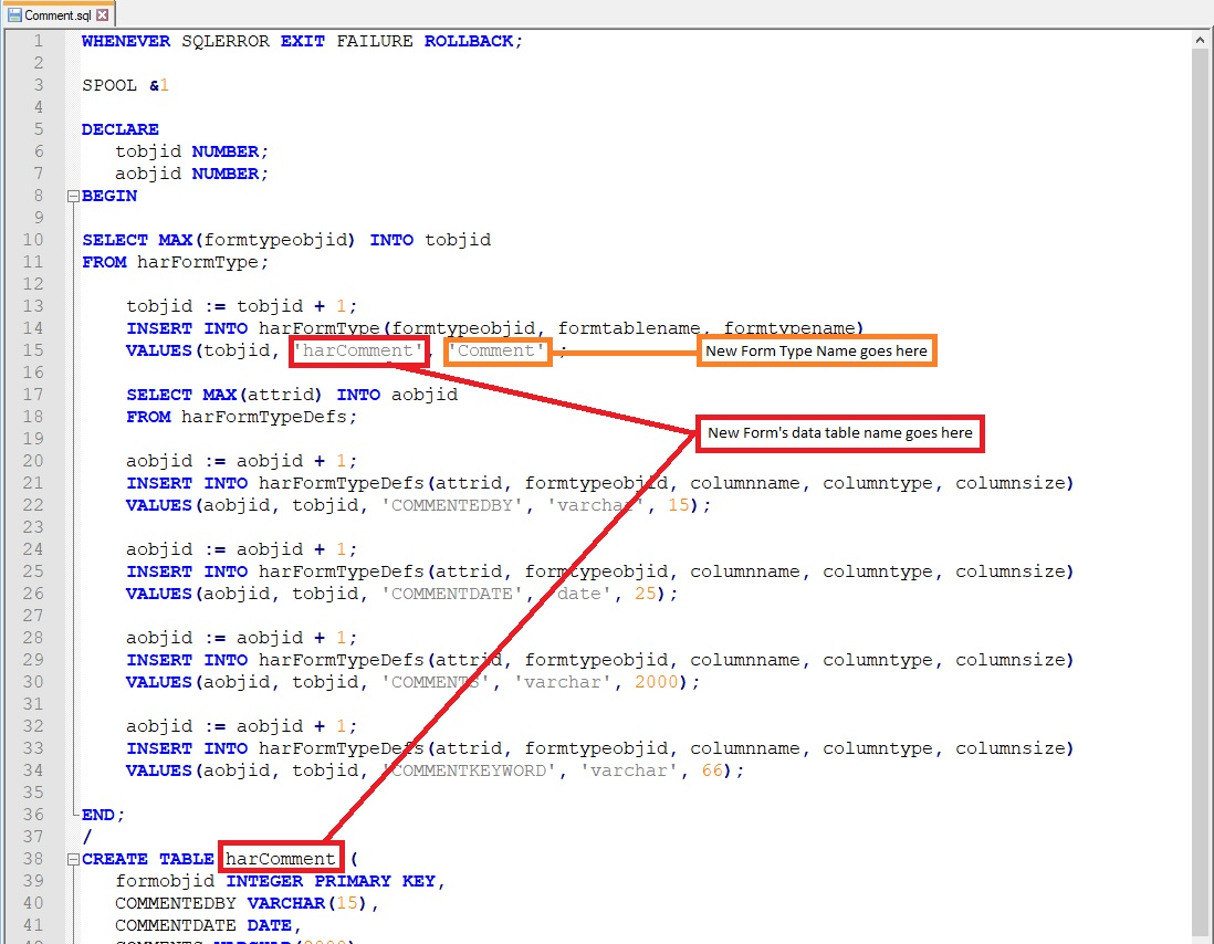 Information about executing the SQL script to set up your form's table can be found here: Add the Form Table to Your CA Harvest SCM Database