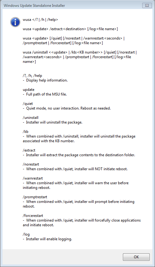 Create a Windows batch file (ie. install-msu.bat) in the same folder as the MSU file (see the following example). This will install the MSU in silent mode and do not prompt for reboot. As the log file from wusa.exe is in Event format evtx, it must be converted to text file so it can be viewed in the Job Output tab of the job. In this example we'll create a package for KB3133719: