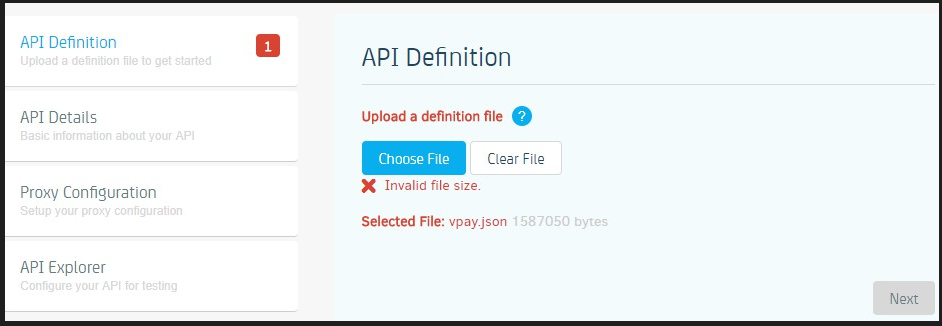 When we try and upload a swagger file that is provided from CA LIVE API Creator 4.1 into CA API Portal 4.2.x we get an error: 'Invalid file size'.