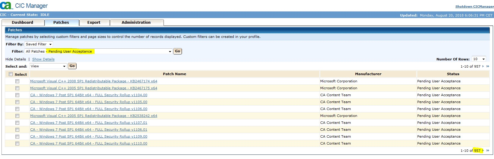 In this example there are 24807 patches in status "Pending User Acceptance" in Online CIC machine (against less than one thousand in Offline Patch Management).