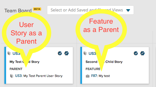 On the Team Board the Parent field is not showing on all cards.  Looking at this further, only stories that have another user story as the parent will show the parent.  User Stories that have a Feature as a parent are not displaying the parent field.