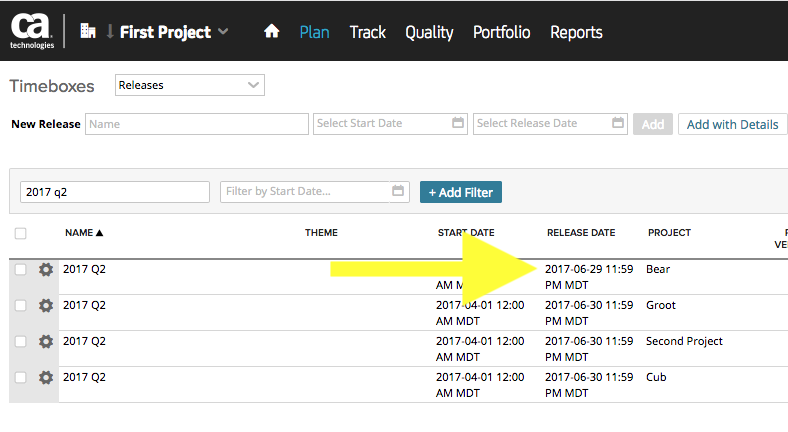 Reviewing this release under Timeboxes, we see that the Release Date for one of the projects is out of sync with the others.