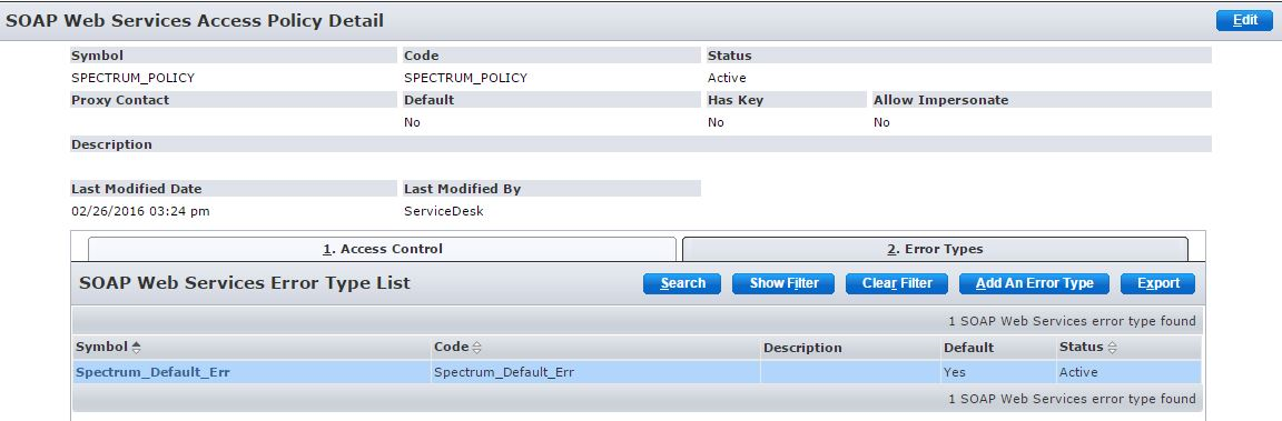First, you must define a SOAP web services policy for Spectrum in Service Desk. To do this, go to the Administration tab, and then select SOAP Web Service Policies->Policies->SPECTRUM_POLICY.