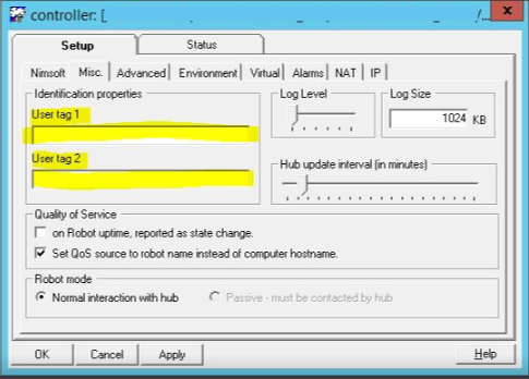 In the Controller probe -> "Setup" tab -> "Misc." tab, there are 2 fields, "User tag 1" and "User tag 2" :