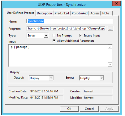 hsync -b [broker] -en [project] -st [state] -vp "\SampleRepository" -cp "C:\Temp" -usr [user] -pw [password] -sy -av -rm <remote hostname> -rport <remote host port> -rusr <remote login user> -rpw <remote login password>