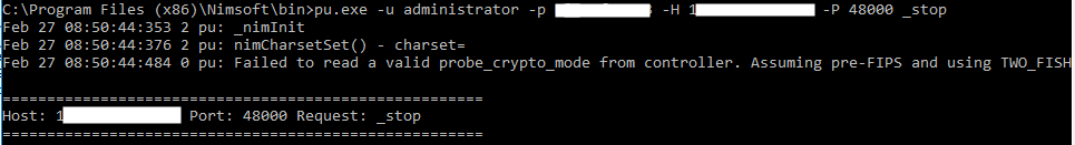 pu.exe -u administrator -p (your UIM password) -H 192.168.0.1 -P 48000 _stop
