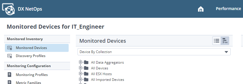 Now users with the IT Engineer Role will be provided with the "Monitored Devices for IT_Engineer" UI when selecting the Data Aggregator from the Administration->Data Sources menu in Performance Center.