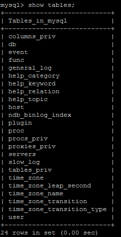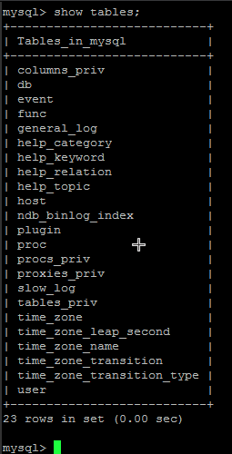 4. At the mysql prompt, enter "show tables;" to see if the servers table is there. The following is an example of the output if the servers table is present: