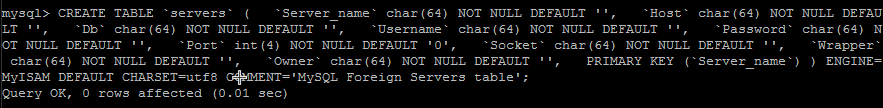 NOTE: You will need to include a semi colon character ; at the end of the last line of the command f. Run "show tables;" to verify the servers table exists