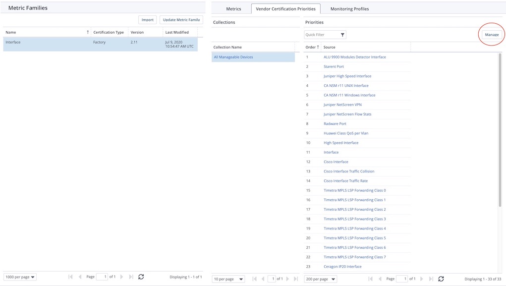 The Vendor Certification (VC) Priority for the Interface Metric Family (MF) was changed. The default order has High Speed Interface above Interface, resulting in its selection as the appropriate VC for the Interface MF: