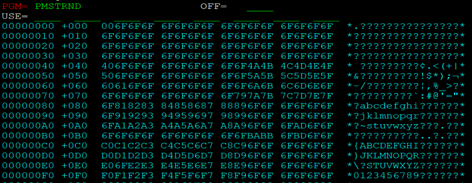 For a list of all displayable character out of the box, issue in IDEAL @I$SCF PGM=PMSTRND. You will dump the load module and see many questions marks. The VER is in place to verify that the question mark ('?') hex character is at that location and you don't accidently replace a character with some other character. Note that there are certain emulator's cannot display certain characters which would be out of IDEAL's control.