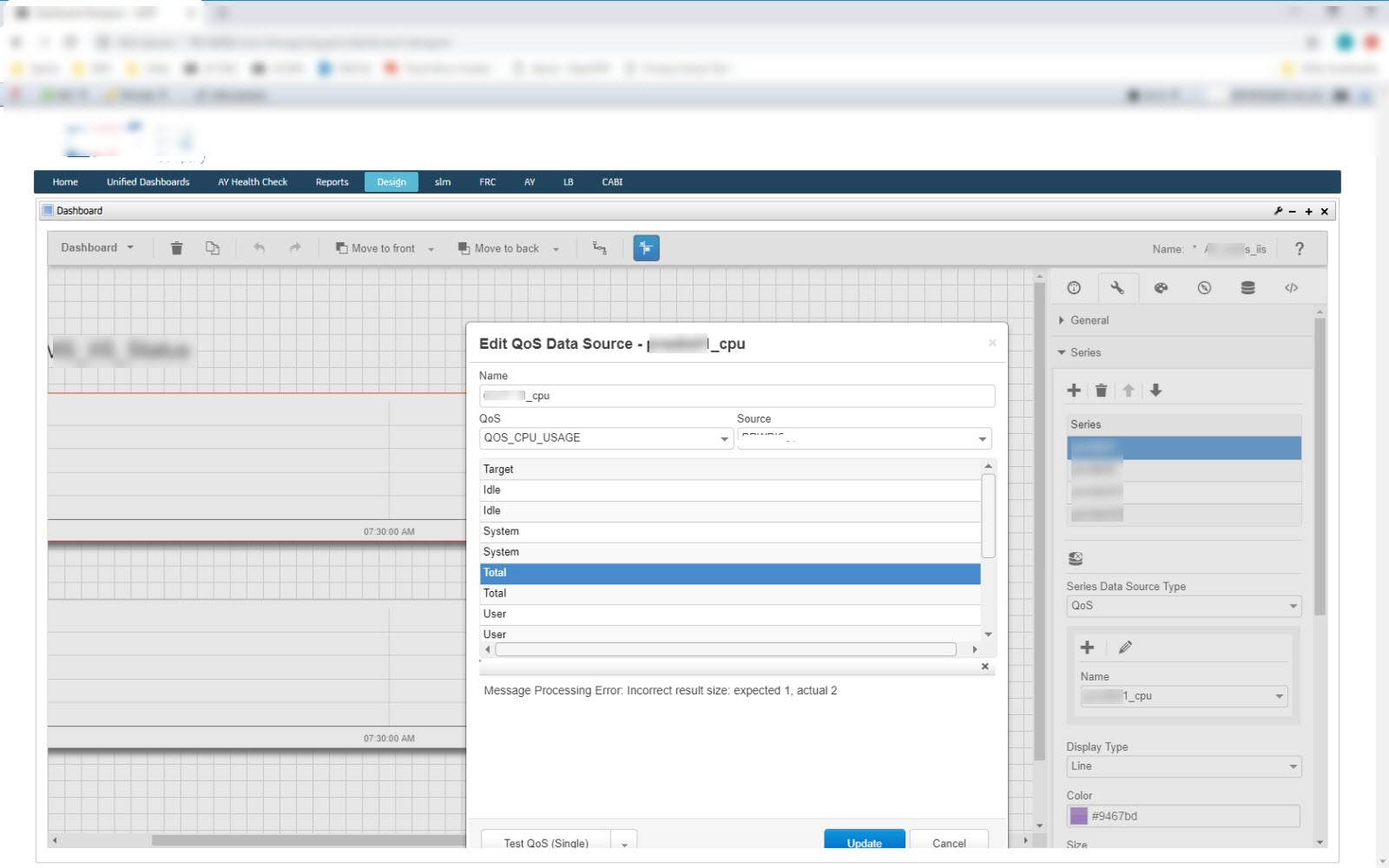 After upgrading UIM from 8.51 to uim 9.0.2 existing dashboard which has qos data source not showing data chart now. Although can confirm that there is data on SLM for same qos metric i.e qos_cpu_usage for total target.
