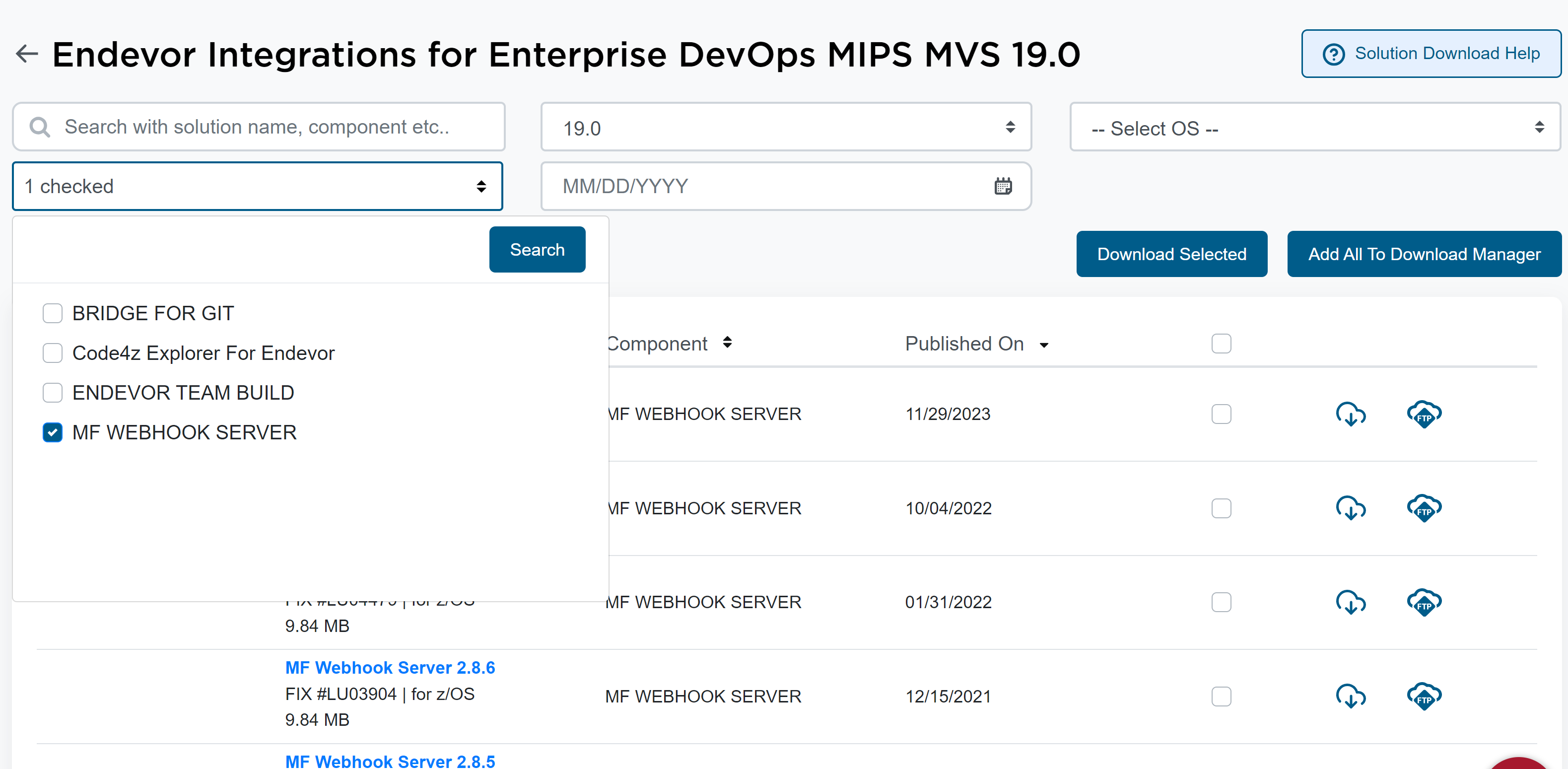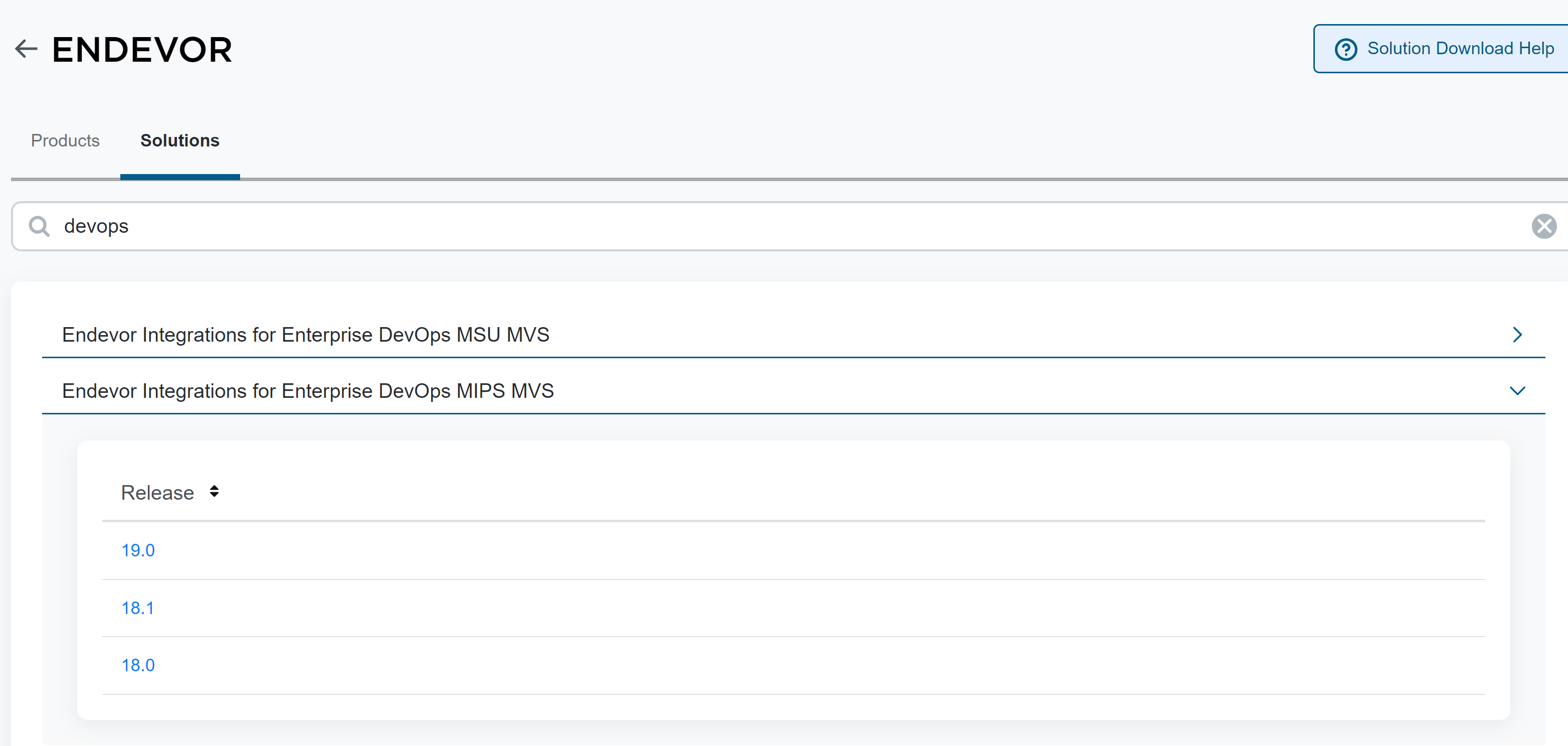 Click any of the link such as Endevor Integrations for Enterprise DevOps MIPS MVS to expand and select 19.0