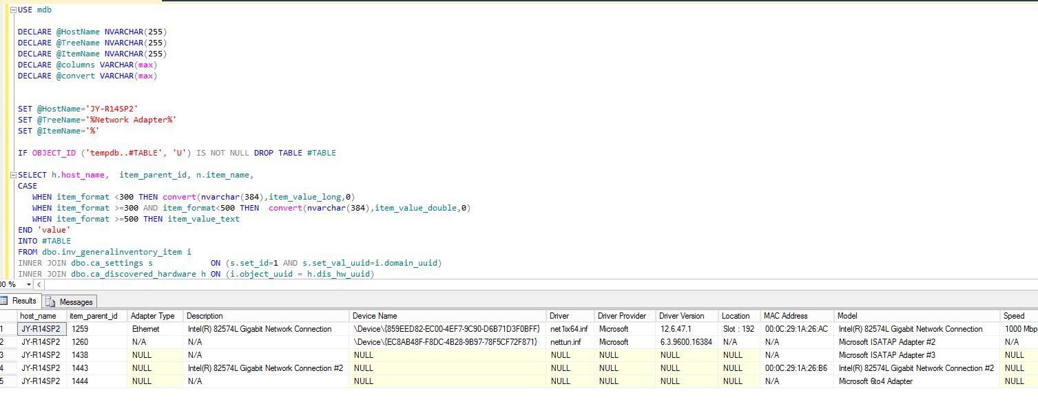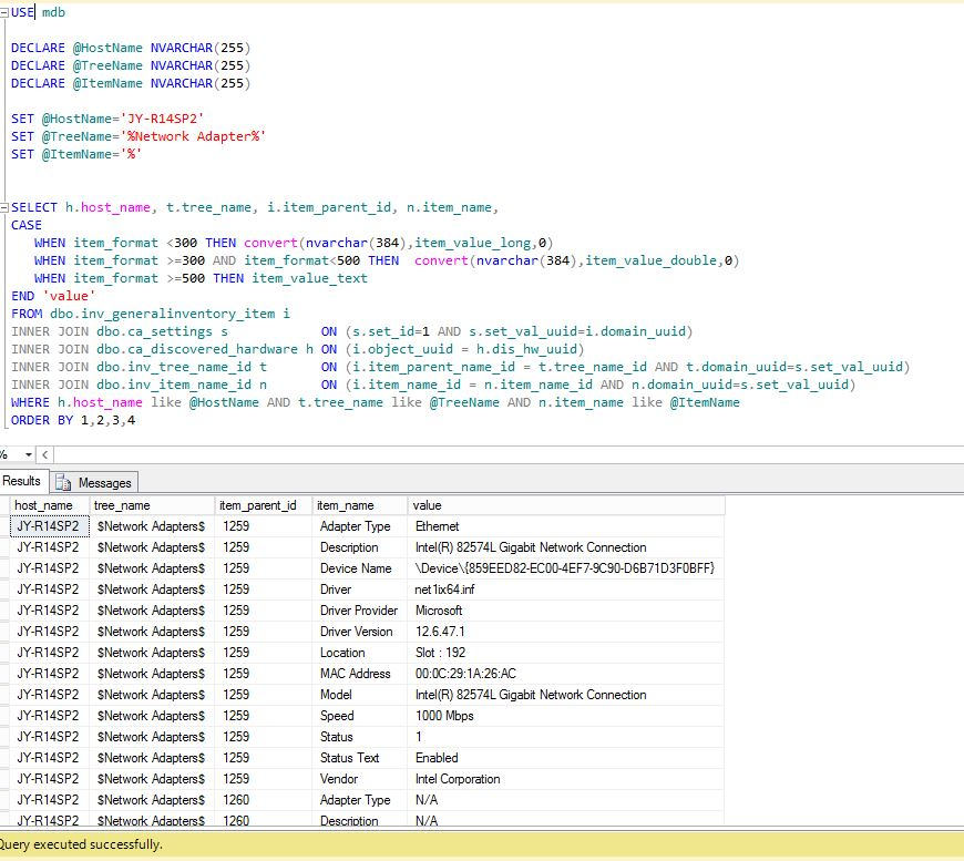 Following query could be used to retrieve "Network Adapter" General Inventory for computer JY-R14SP2.