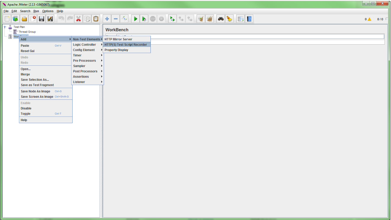 When trying to use the JMeter desktop application and the browser proxy function to record scripts, the items available when right-clicking the Workbench element in the left pane and then clicking Add -> Non-Test Elements do not include the item "HTTP Proxy Server".