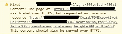 The page at https://URL.DOMAIN.COM was loaded over https, but requested an insecure resource http://SERVER:8080/CAisd/PDMExport