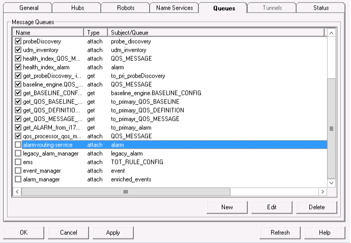 7. Delete the alarm-routing-service, ems, alarm_manager, legacy_alarm_manager, event_manager queues from the hub GUI
