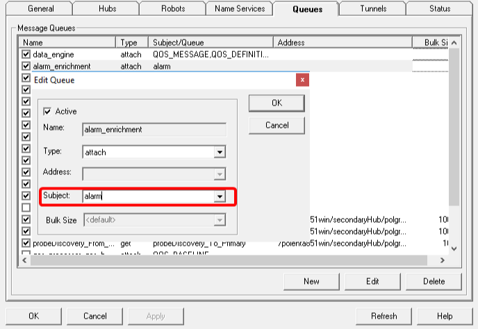 8. Modify the alarm_enrichment queue and change the subject from alarm1 -back to- alarm