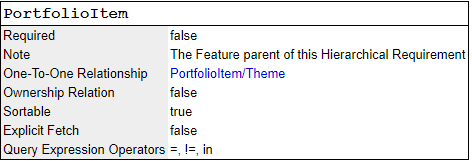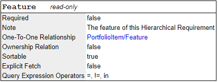 - Feature - This field is not necessarily Feature. It is by the name of your workspace's lowest-level portfolio hierarchy. This is a read-only field can can not be set (either from WSAPI or from UI). It is optional to associate user stories with portfolio items. However, if associated then the entire hierarchy will be associated to the same portfolio item object. This field is used to GET the information of if/which portfolio item is linked with the story.