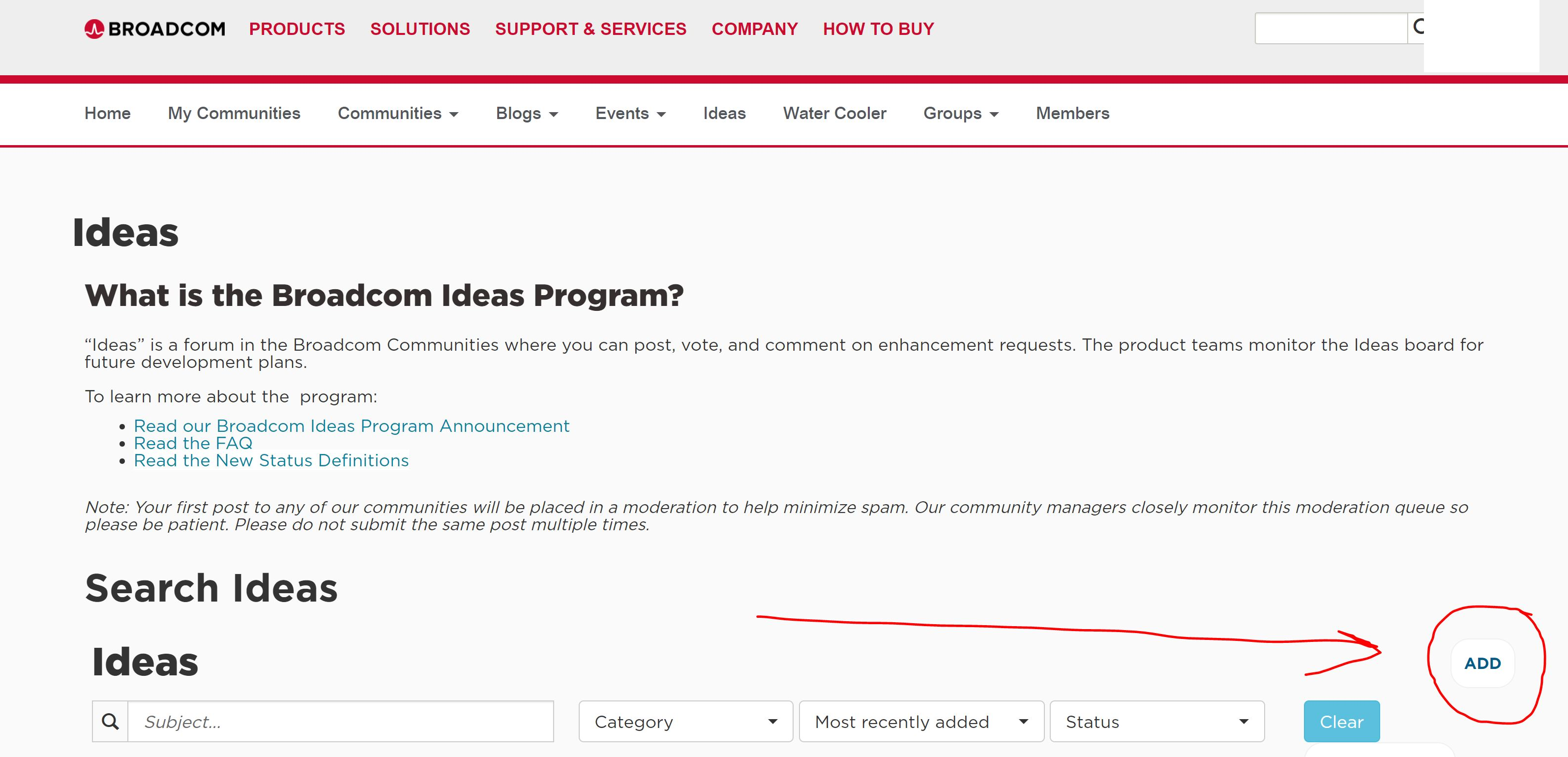 Note, the initial landing page of the community may appear with different images and wording from time to time, but the banner at the top with the IDEAS link should remain the same.