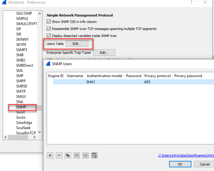 To decode the SNMP reports from the device in Wireshark, you can go to Edit->Preferences->Protocols->SNMP.