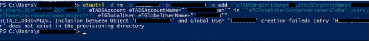 ETA_E_0030<MGU>, Inclusion between Object '<AD Account Name>' and Global User '<Global User Name>' creation failed: Entry '<AD Account Name>' does not exist in the provisioning directory