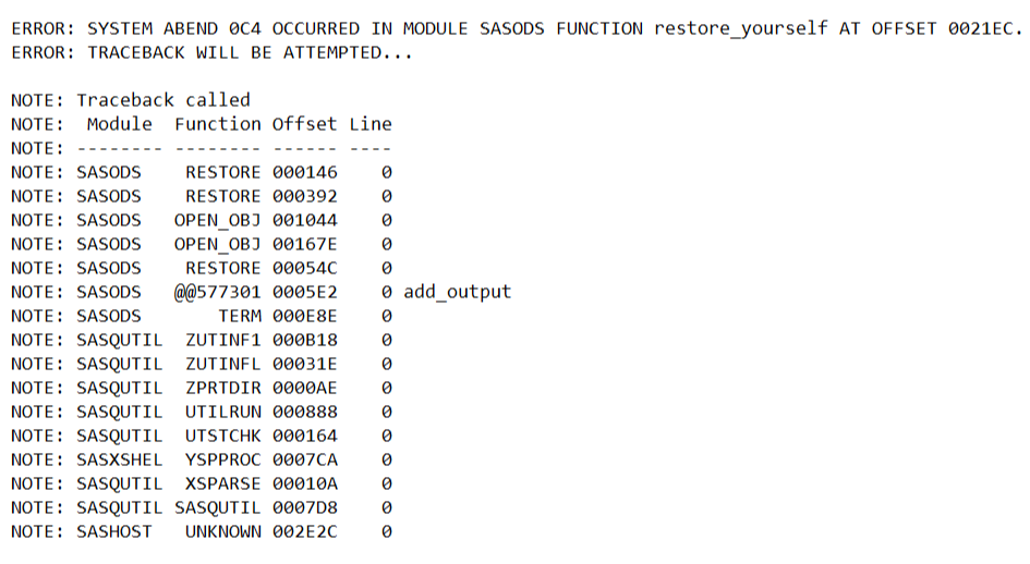 The first DAILY job to process since the fallback failed with a S0C4 abend in the DAY020 step. The SASLOG contains the following: