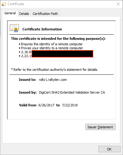 This issue is typically caused by a self-signed certificate that is being deployed to end users. The Rally certificate should appear as follows when examined: