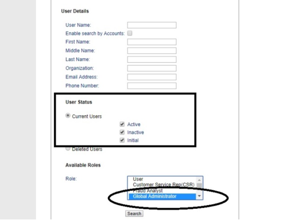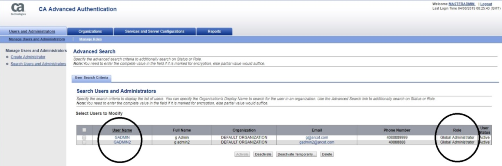CA Strong Authentication and CA Risk Authentication servers are administered via Master Administration UI. The Master Administration console allows one to generate a list of Admins in say "Global Administrator" role or say "Organization Administrator" role etc (to name a few roles). Furthermore, the Admin list to extract can be refined on the basis of Admin's "User Status". There are three possible "User Status" for an Admin user.