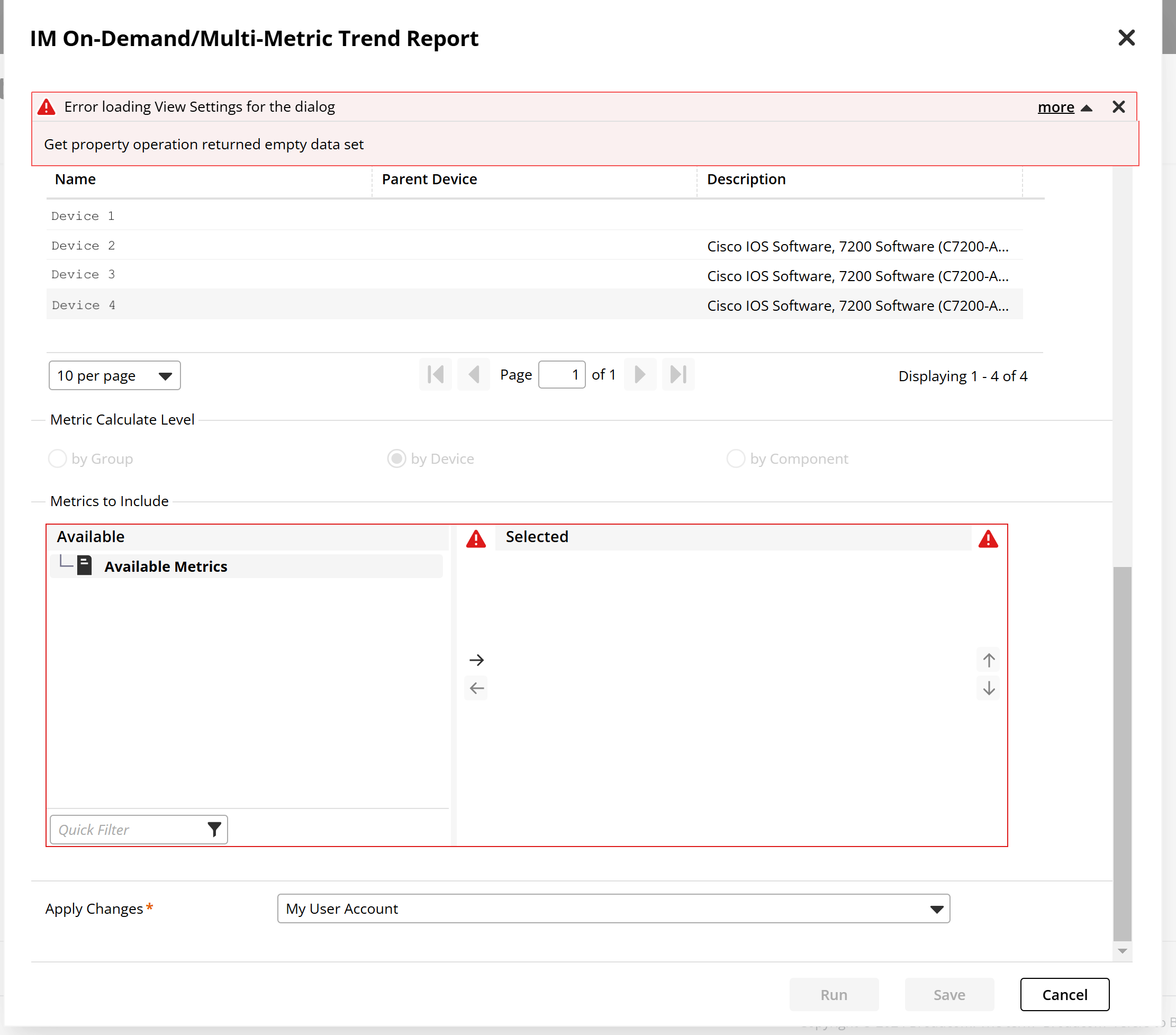 On NetOps Portal from Reports->New, I get below error and the template run & save options are grayed out. I also noticed there is no available metrics to select. We only have a Spectrum Data Source integrated with Portal.