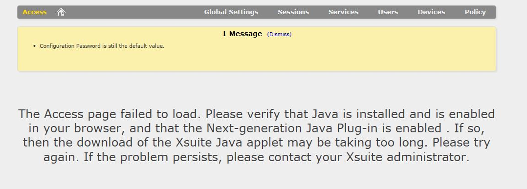 In order to load the access policies CA PAM needs to run a Java applet. In the picture above you can see that it is attempting to load the necessary applet. The icon will continue to spin for a while and will eventually time out, and no policies will load as a result. This means that the user will not be able to perform their job, as they have no way to connect to the required devices. The picture below shows the message seen after the timeout.