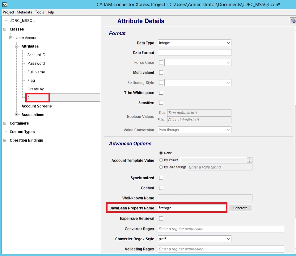 1. Open the Project again using Connector Xpress and change beanPropertyName of the missing attribute to string value. Select the attribute on the Mapping Tree pane (left pane) to show its Attribute Details page. On top please change Name (displayName) field to string value. At the bottom Advanced Options section, set JavaBean Property Name (beanPropertyName) to the same string value. Do similarly for other missing attributes.