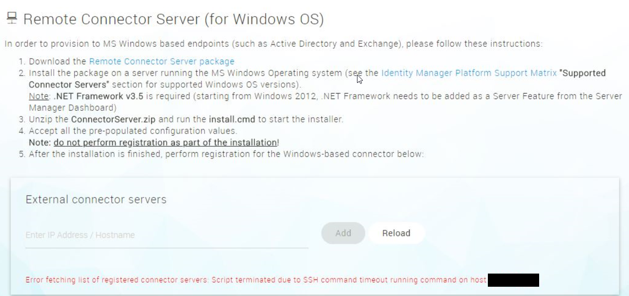 Error fetching list of registered connector servers: Script terminated due to SSH command timeout running command on host <IP Address>
