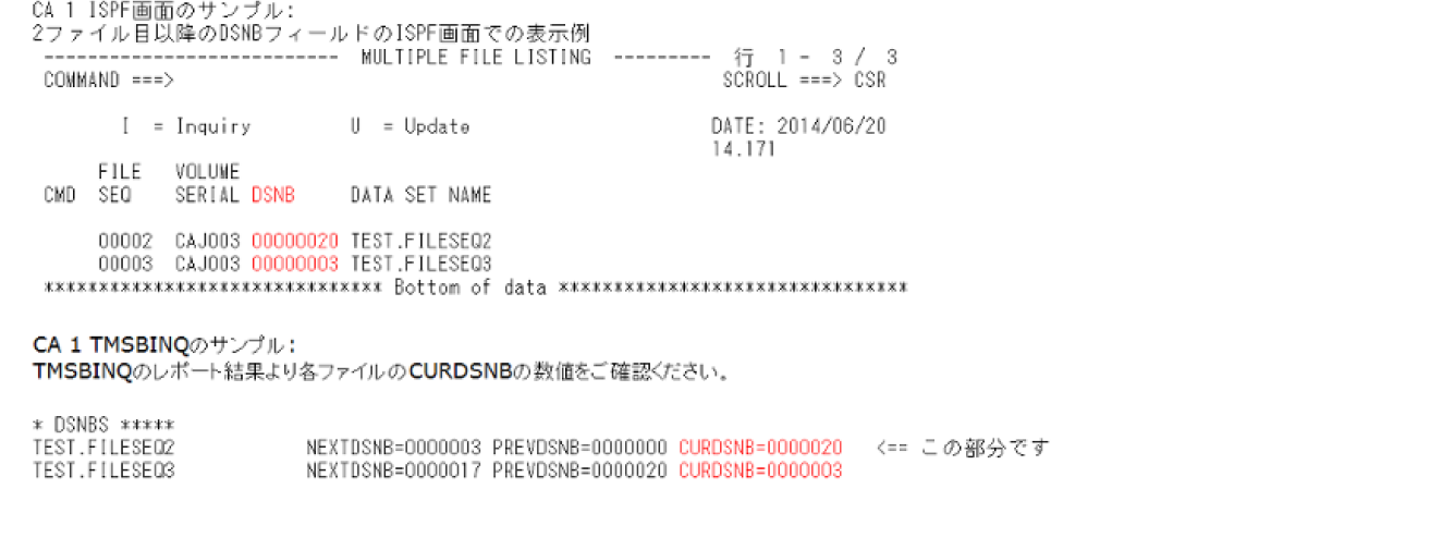 ※DSNB番号が不明な場合には、CA1のISPFパネルかTMSBINQユーティリティのレポートよりCURDSNBの数値にて確認できます。