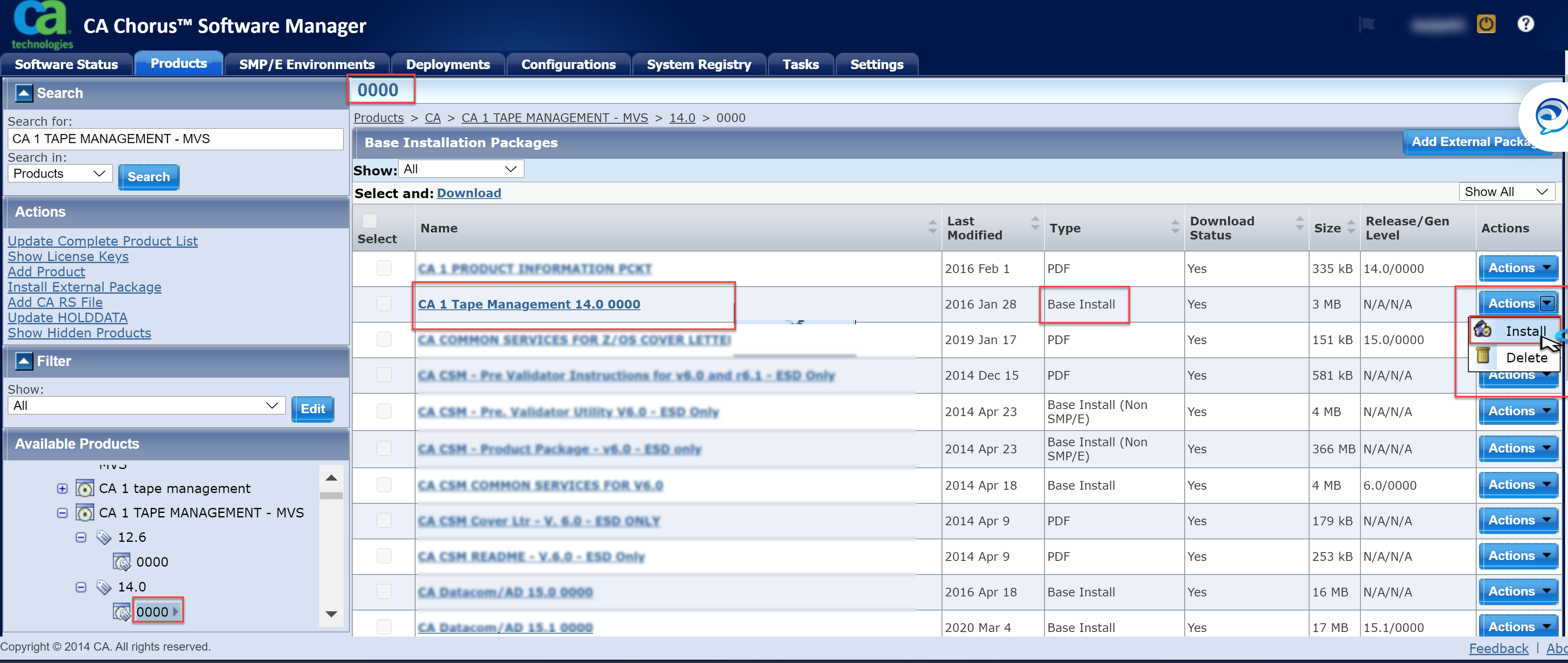 2. Find the Base Install for CA 1 TAPE MANAGEMENT, click ACTION on right and then select Install