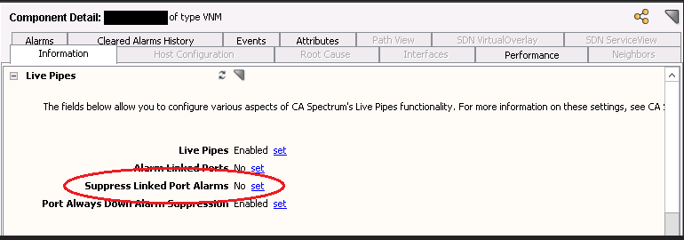 2. Set Suppressed Linked Port Alarms to No in the Live Pipes subview of the VNM model